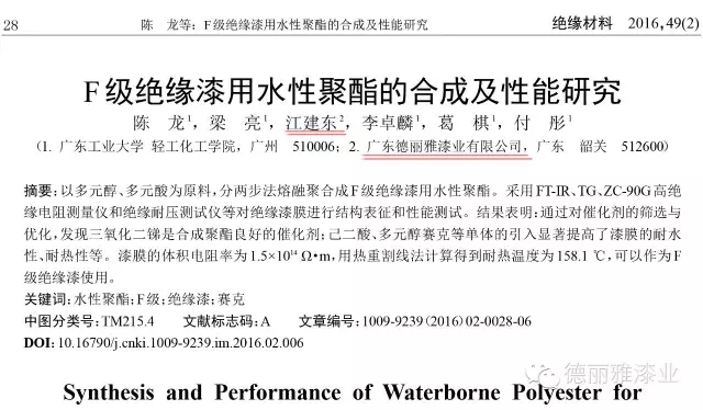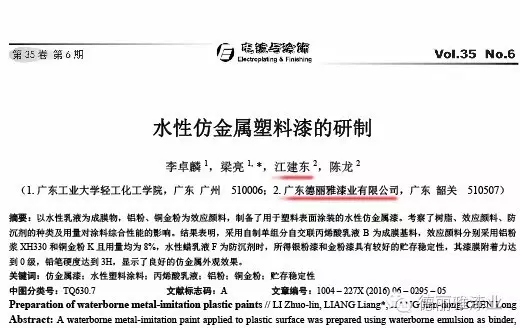近期分別在知名雜志《絕緣材料》發(fā)表了論文《F級絕緣漆用水性聚氨酯的合成及性能研究》和知名雜志《電鍍與涂飾》發(fā)表了論文《水性仿金屬塑料漆的研制》。